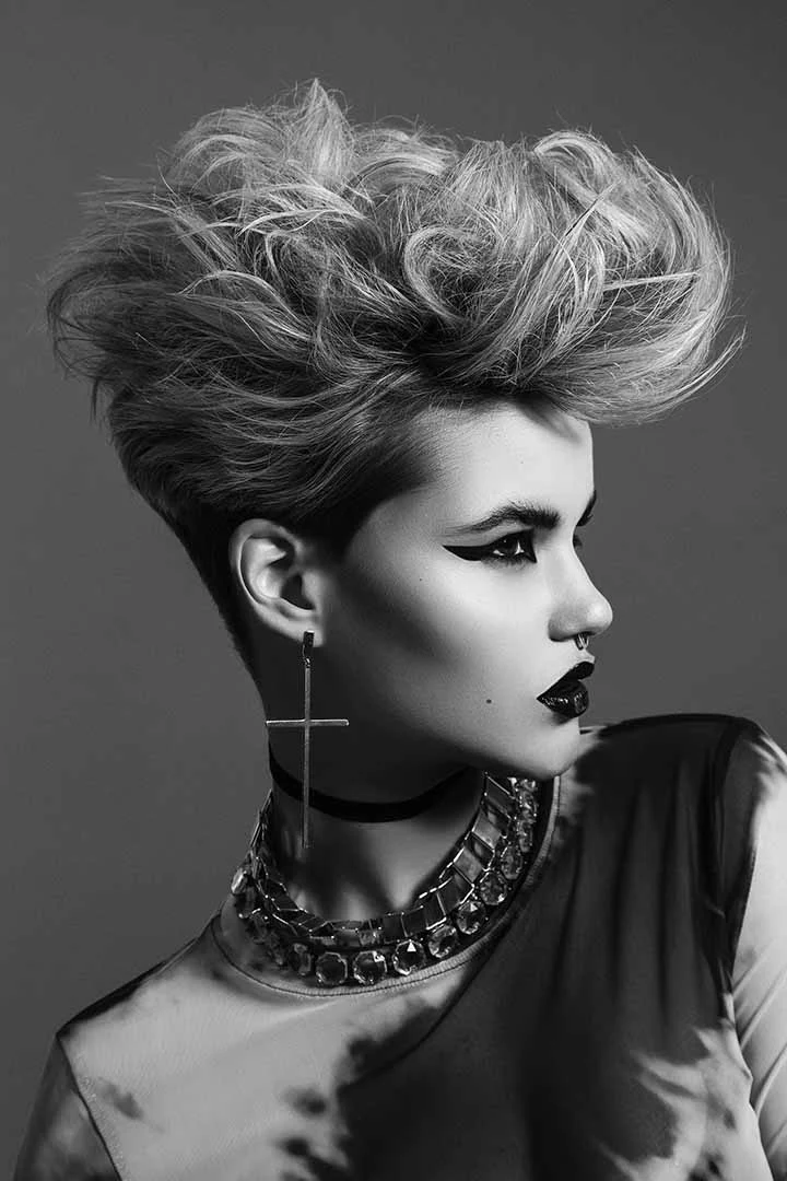Inspiración para cortes de pelo 2020 colección que está enraizada en la escena glam punk de Londres durante los años setenta. Una época en la que David Bowie, T-Rex, Alice Cooper y los New York Dolls fueron ídolos durante una generación que buscaba separarse de la música hippie de los sesenta. Miradas definidas que presentan características frontales distintivas que resaltan los rasgos faciales.